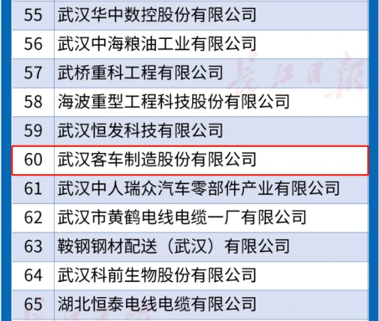 ? ? ? 9月25日,經(jīng)過武漢企業(yè)聯(lián)合會(huì)、武漢企業(yè)家協(xié)會(huì)聯(lián)合長江日報(bào)報(bào)業(yè)集團(tuán)、武漢廣播電視臺(tái)、武漢發(fā)展戰(zhàn)略研究院共同組織,在遵循企業(yè)自愿申報(bào)原則的基礎(chǔ)上,以2019年度營業(yè)收入為依據(jù),“2020年武漢企業(yè)100強(qiáng)(綜合百強(qiáng))”、“制造業(yè)企業(yè)100強(qiáng)(制造業(yè)百強(qiáng))”、“服務(wù)業(yè)企業(yè)100強(qiáng)(服務(wù)業(yè)百強(qiáng))” 排序榜正式發(fā)布。武漢客車制造股份有限公司位列2020武漢制造業(yè)企業(yè)第六十名!